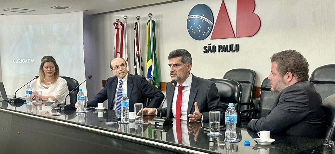 Da esquerda para a direita: Juíza Paula Fernanda Navarro, coordenadora da Upefaz, advogado Felippo Scolari, presidente da Comissão de Precatórios da OAB SP, desembargador Afonso Faro Júnior, coordenador da Depre, e o advogado Vitor Augusto Boari, presidente do Madeca.