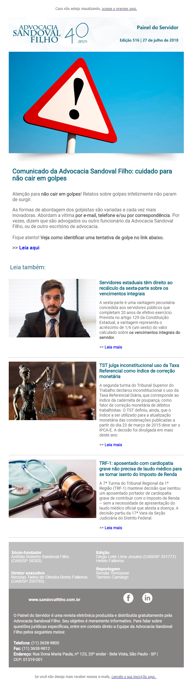 Confira a edição nº 516 do Painel do Servidor, enviada no dia 27 de julho de 2018.