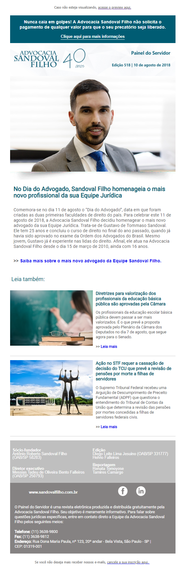 Nunca caia em golpes! A Advocacia Sandoval Filho não solicita o pagamento de qualquer valor para que o seu precatório seja liberado.