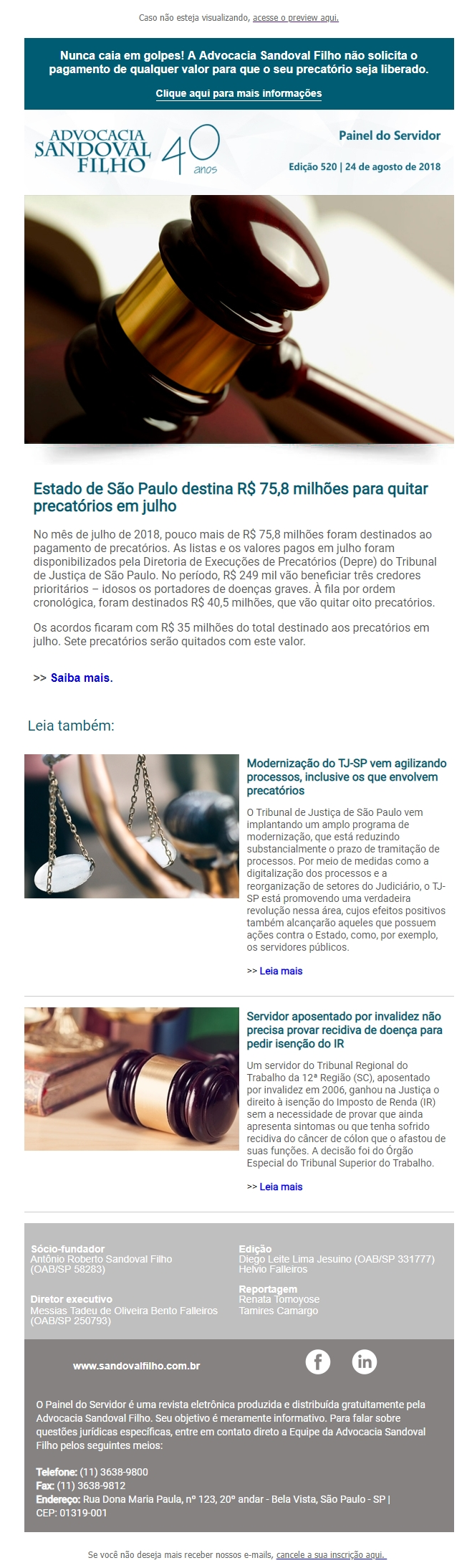 Nunca caia em golpes! A Advocacia Sandoval Filho não solicita o pagamento de qualquer valor para que o seu precatório seja liberado.