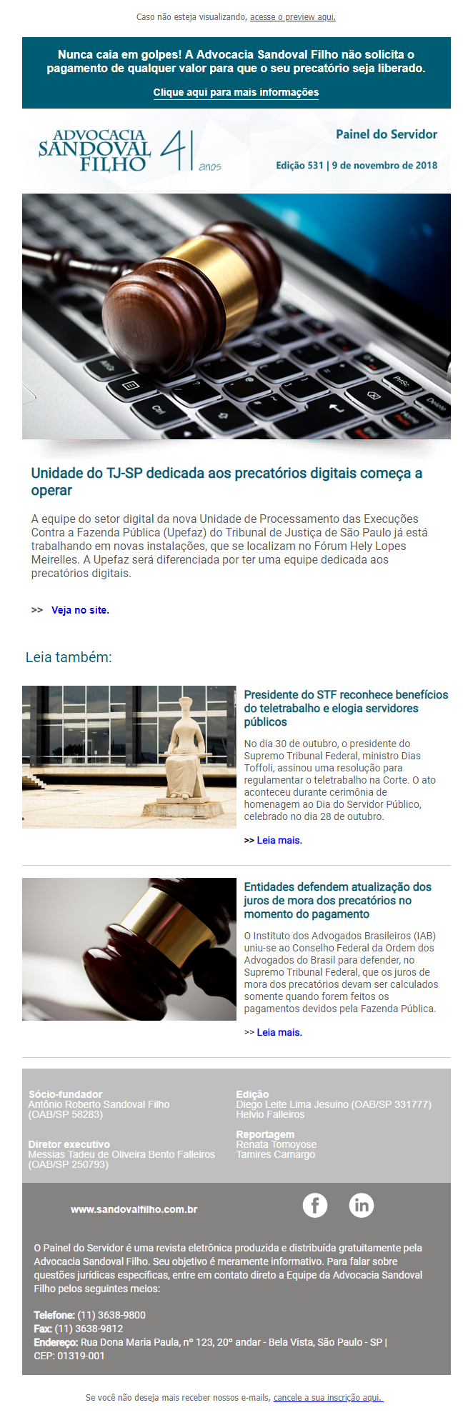 Nunca caia em golpes! A Advocacia Sandoval Filho não solicita o pagamento de qualquer valor para que o seu precatório seja liberado.