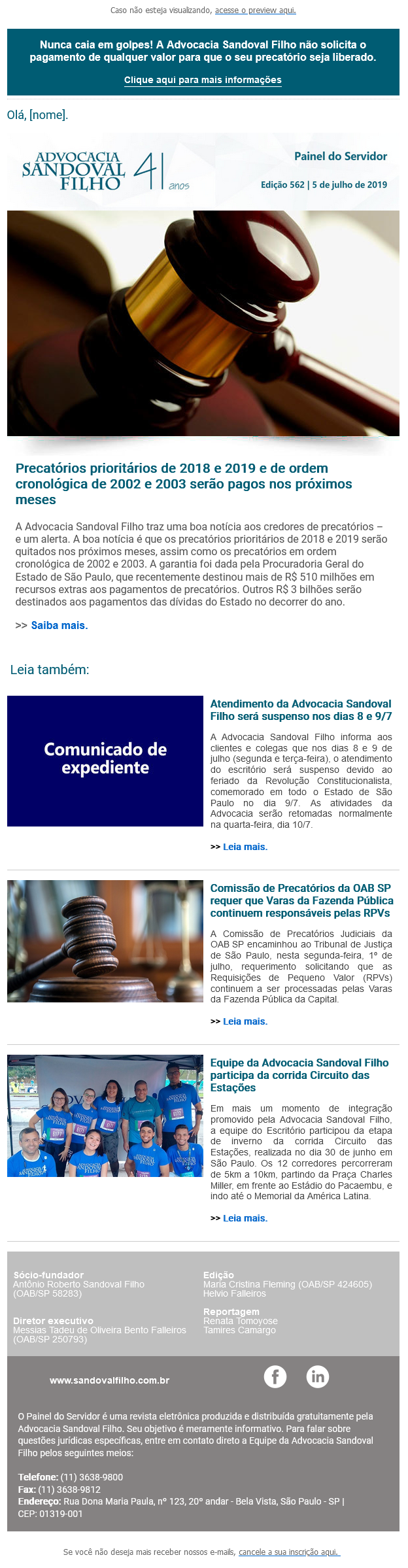 Nunca caia em golpes! A Advocacia Sandoval Filho não solicita o pagamento de qualquer valor para que o seu precatório seja liberado.