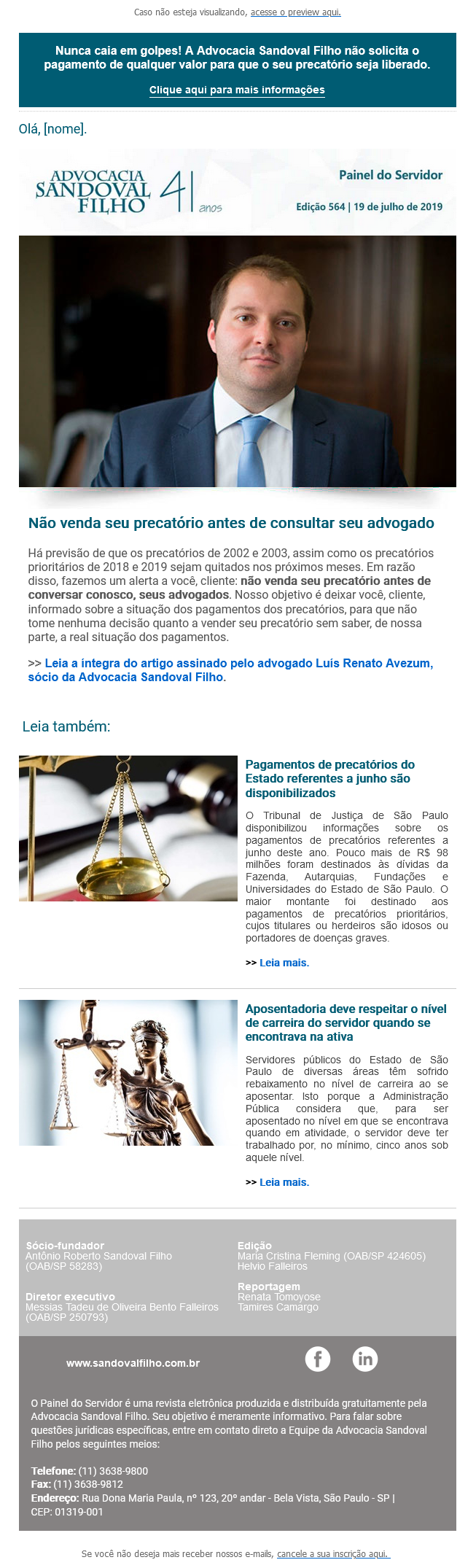 Nunca caia em golpes! A Advocacia Sandoval Filho não solicita o pagamento de qualquer valor para que o seu precatório seja liberado.
