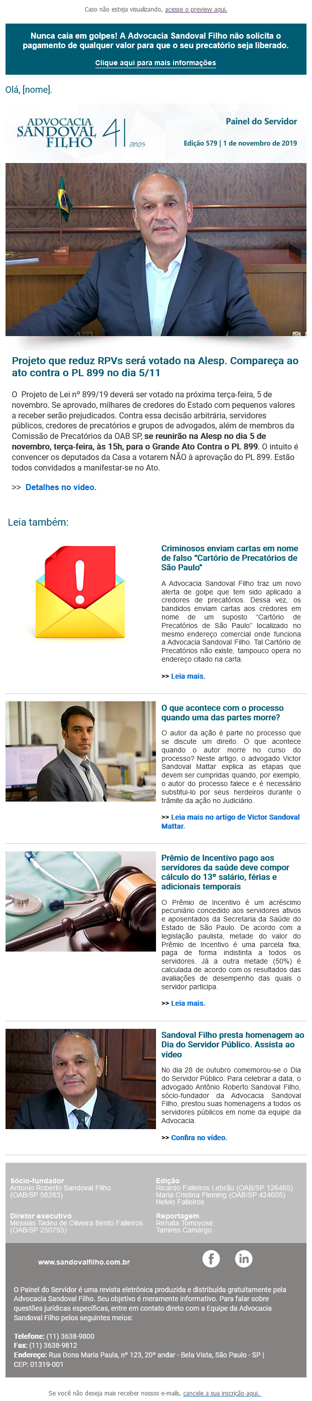 Nunca caia em golpes! A Advocacia Sandoval Filho não solicita o pagamento de qualquer valor para que o seu precatório seja liberado.