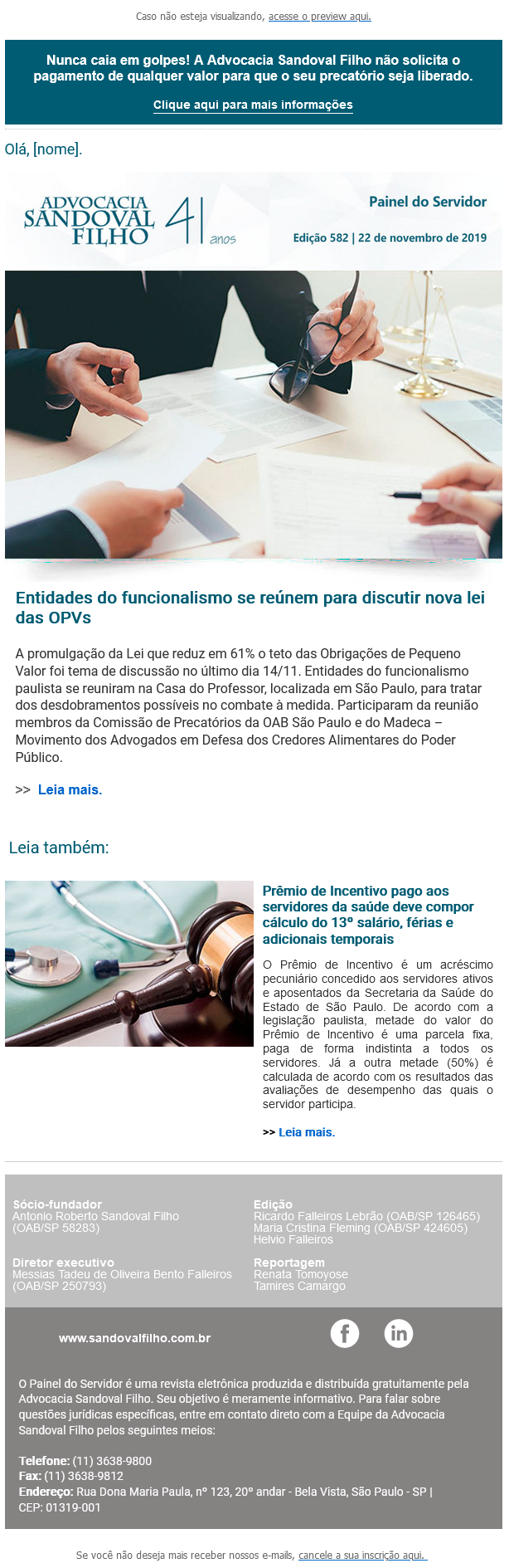 Nunca caia em golpes! A Advocacia Sandoval Filho não solicita o pagamento de qualquer valor para que o seu precatório seja liberado.