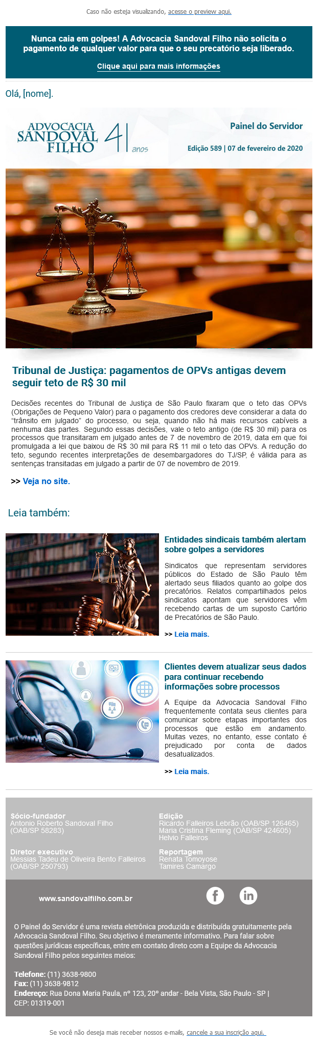 Nunca caia em golpes! A Advocacia Sandoval Filho não solicita o pagamento de qualquer valor para que o seu precatório seja liberado.