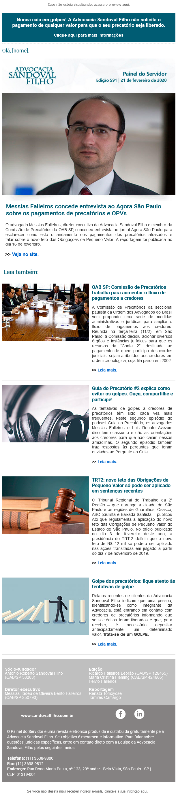 Nunca caia em golpes! A Advocacia Sandoval Filho não solicita o pagamento de qualquer valor para que o seu precatório seja liberado.