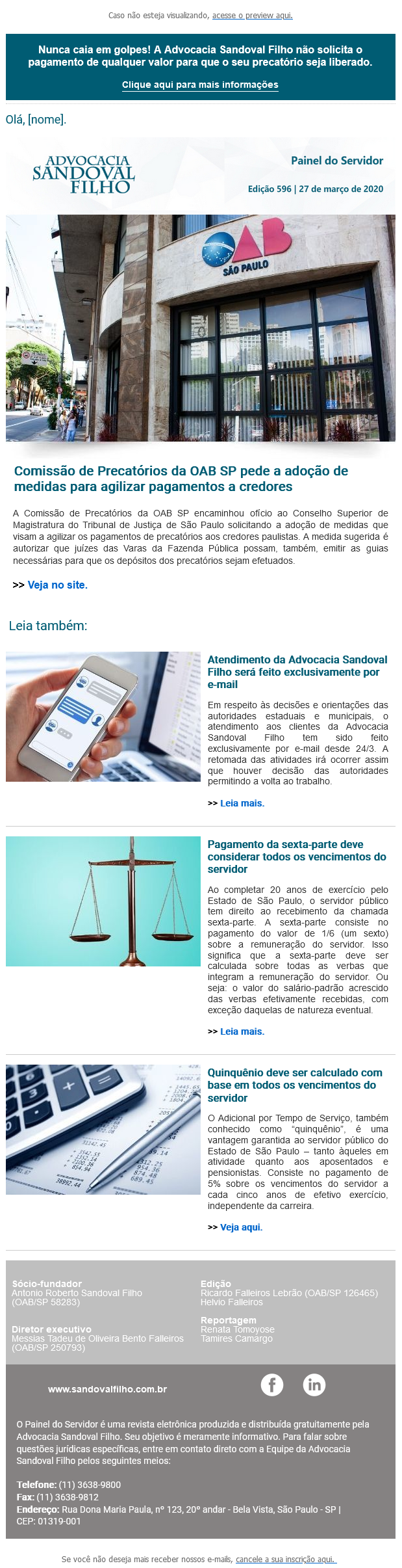 Nunca caia em golpes! A Advocacia Sandoval Filho não solicita o pagamento de qualquer valor para que o seu precatório seja liberado.