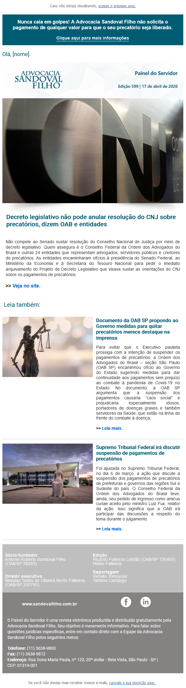 Nunca caia em golpes! A Advocacia Sandoval Filho não solicita o pagamento de qualquer valor para que o seu precatório seja liberado.