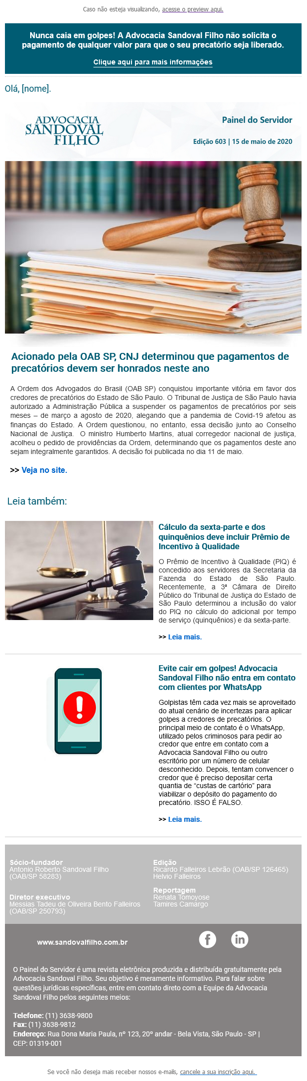 Nunca caia em golpes! A Advocacia Sandoval Filho não solicita o pagamento de qualquer valor para que o seu precatório seja liberado.
