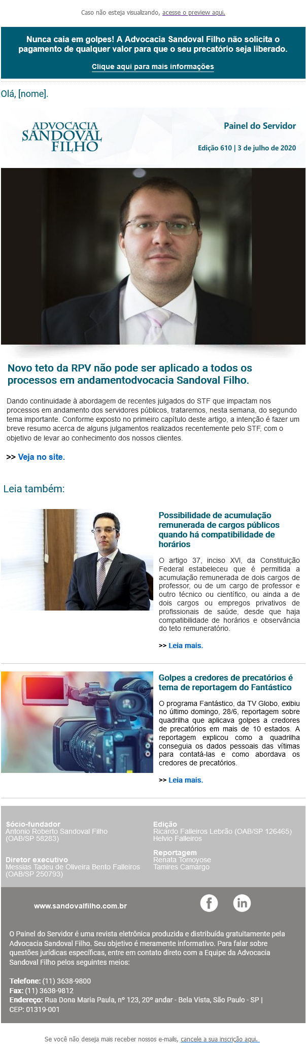 Nunca caia em golpes! A Advocacia Sandoval Filho não solicita o pagamento de qualquer valor para que o seu precatório seja liberado.