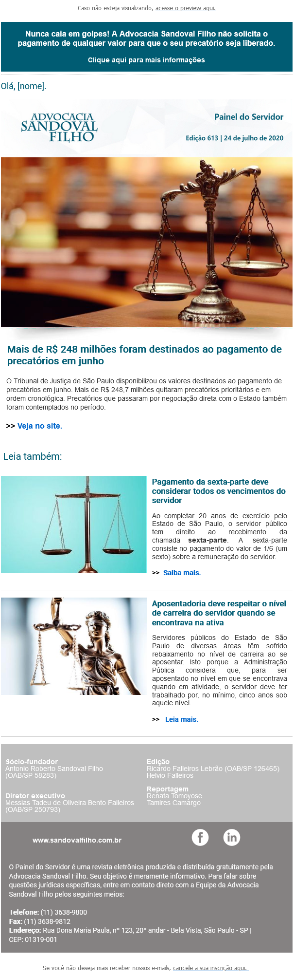 Nunca caia em golpes! A Advocacia Sandoval Filho não solicita o pagamento de qualquer valor para que o seu precatório seja liberado.