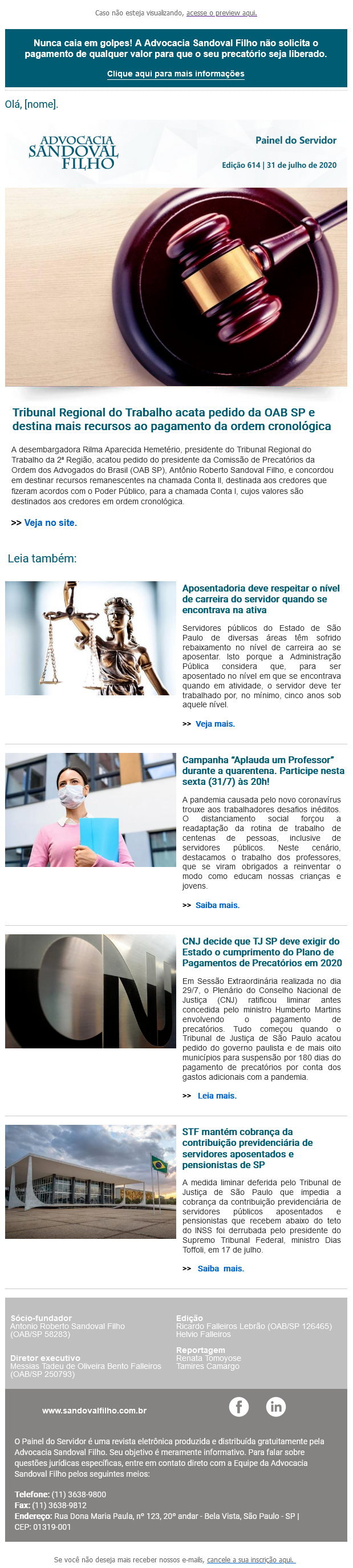 Nunca caia em golpes! A Advocacia Sandoval Filho não solicita o pagamento de qualquer valor para que o seu precatório seja liberado.