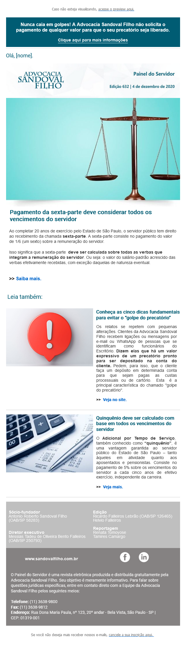 Nunca caia em golpes! A Advocacia Sandoval Filho não solicita o pagamento de qualquer valor para que o seu precatório seja liberado.