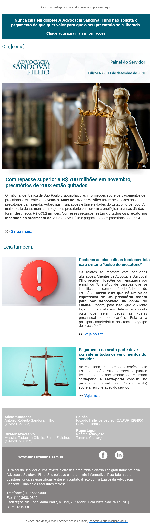 Nunca caia em golpes! A Advocacia Sandoval Filho não solicita o pagamento de qualquer valor para que o seu precatório seja liberado.