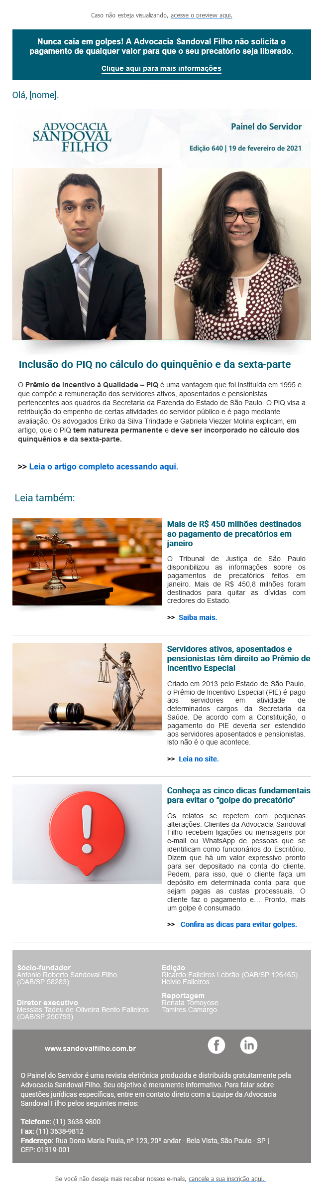 Nunca caia em golpes! A Advocacia Sandoval Filho não solicita o pagamento de qualquer valor para que o seu precatório seja liberado.