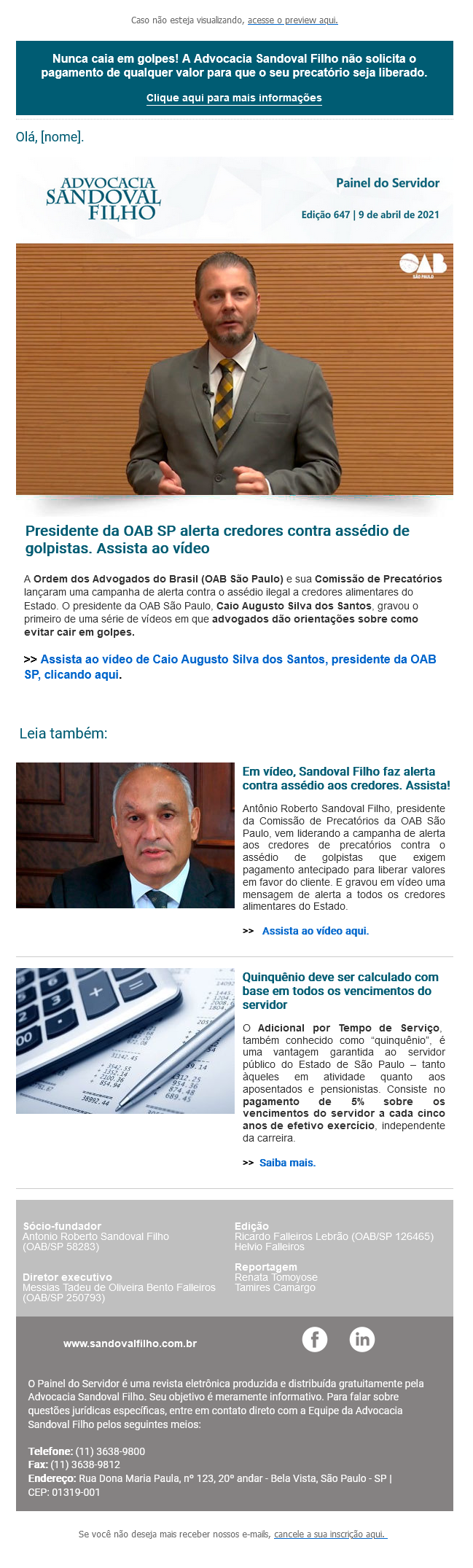 Nunca caia em golpes! A Advocacia Sandoval Filho não solicita o pagamento de qualquer valor para que o seu precatório seja liberado.