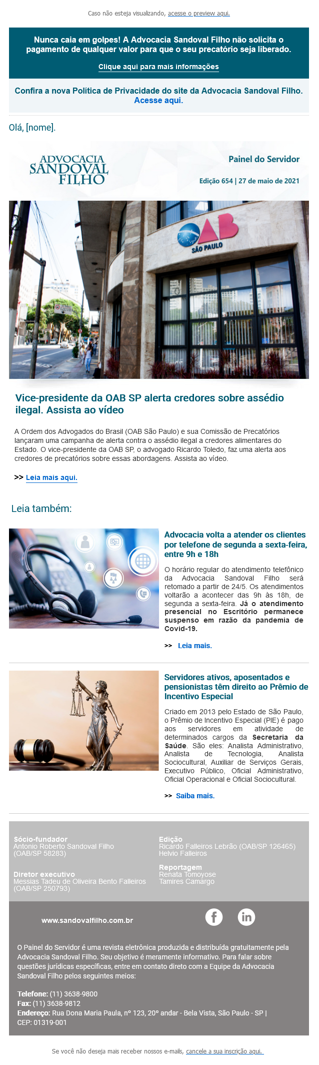 Nunca caia em golpes! A Advocacia Sandoval Filho não solicita o pagamento de qualquer valor para que o seu precatório seja liberado.