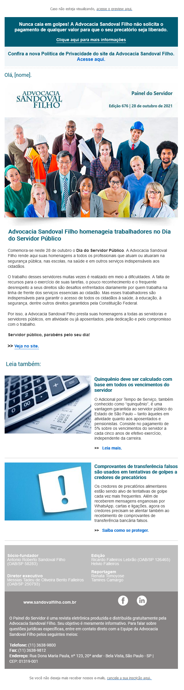 Nunca caia em golpes! A Advocacia Sandoval Filho não solicita o pagamento de qualquer valor para que o seu precatório seja liberado.