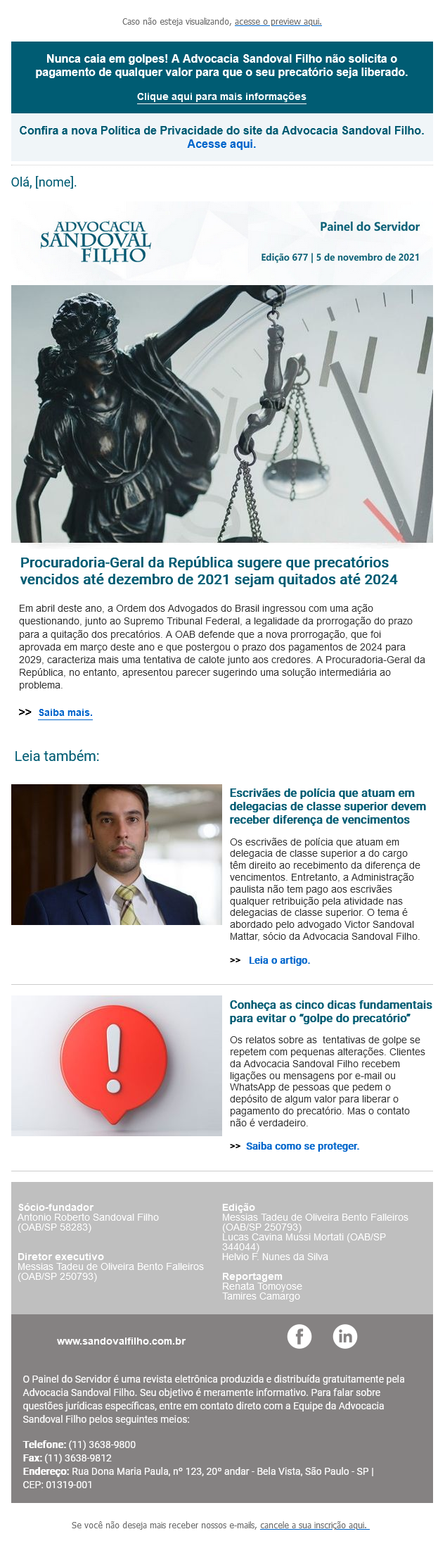 Nunca caia em golpes! A Advocacia Sandoval Filho não solicita o pagamento de qualquer valor para que o seu precatório seja liberado.