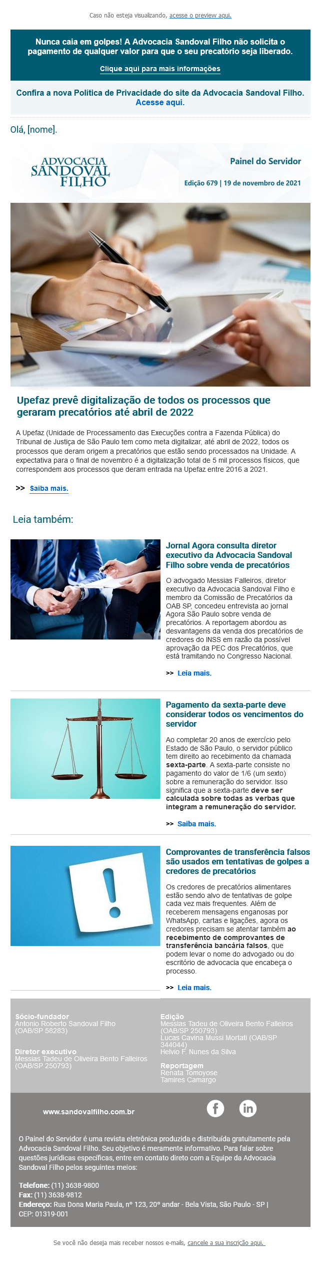 Nunca caia em golpes! A Advocacia Sandoval Filho não solicita o pagamento de qualquer valor para que o seu precatório seja liberado.