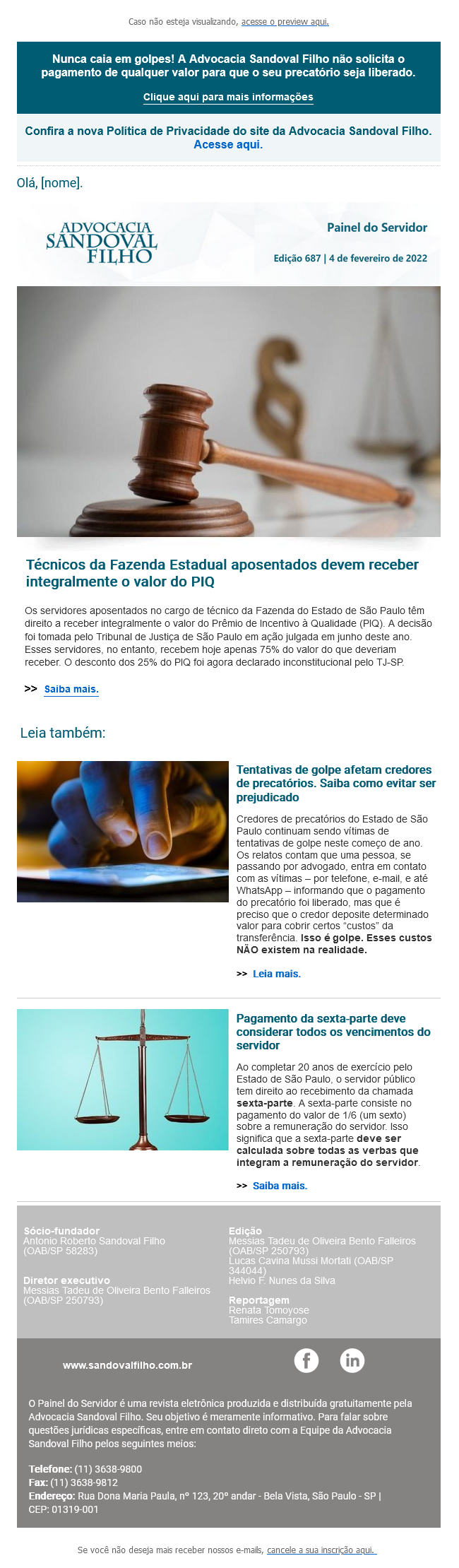 Confira a edição nº 687 do Painel do Servidor, enviada no dia 4 de fevereiro de 2022.