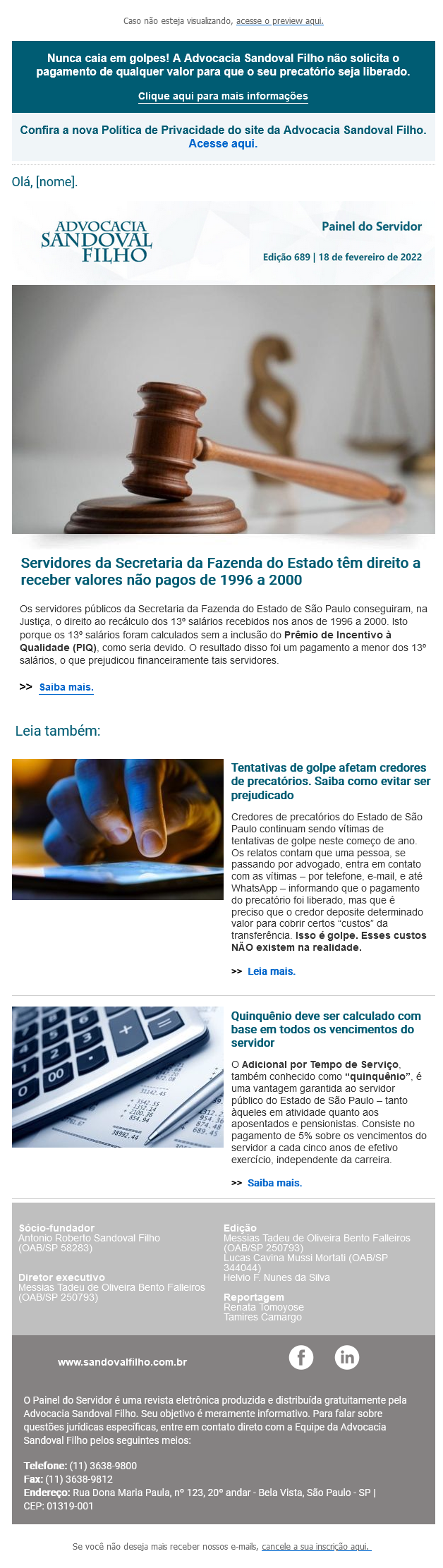 Nunca caia em golpes! A Advocacia Sandoval Filho não solicita o pagamento de qualquer valor para que o seu precatório seja liberado.