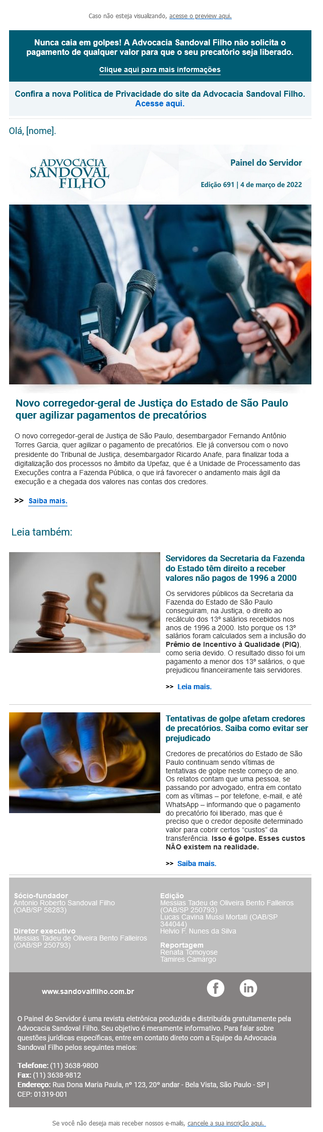 Nunca caia em golpes! A Advocacia Sandoval Filho não solicita o pagamento de qualquer valor para que o seu precatório seja liberado.