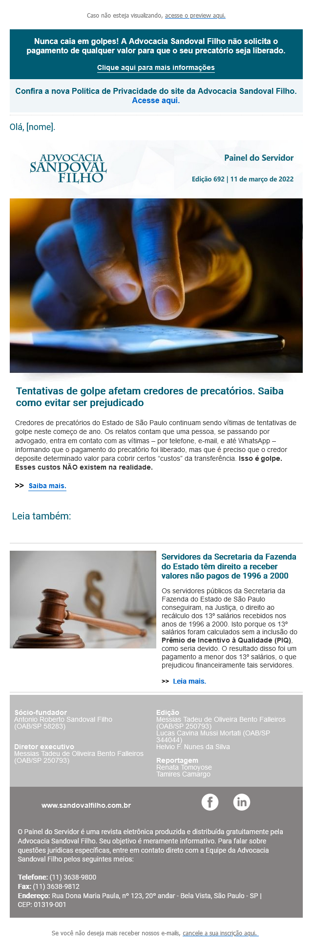 Nunca caia em golpes! A Advocacia Sandoval Filho não solicita o pagamento de qualquer valor para que o seu precatório seja liberado.