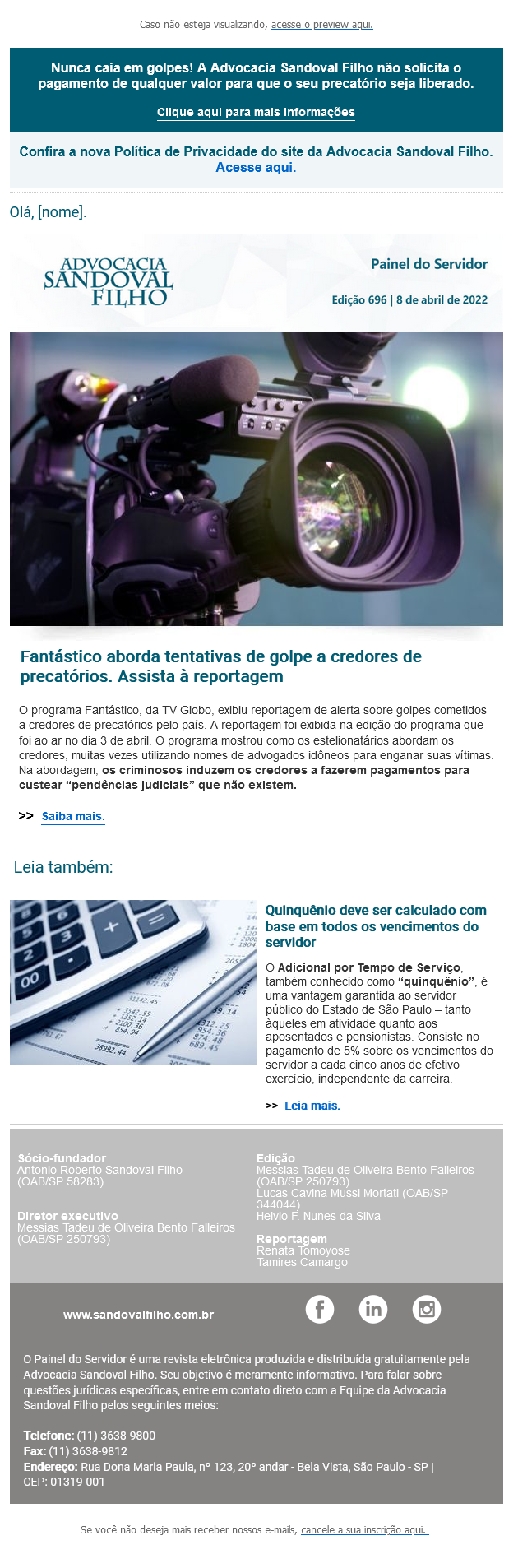 Confira a edição nº 696 do Painel do Servidor, enviada no dia 8 de abril de 2022.