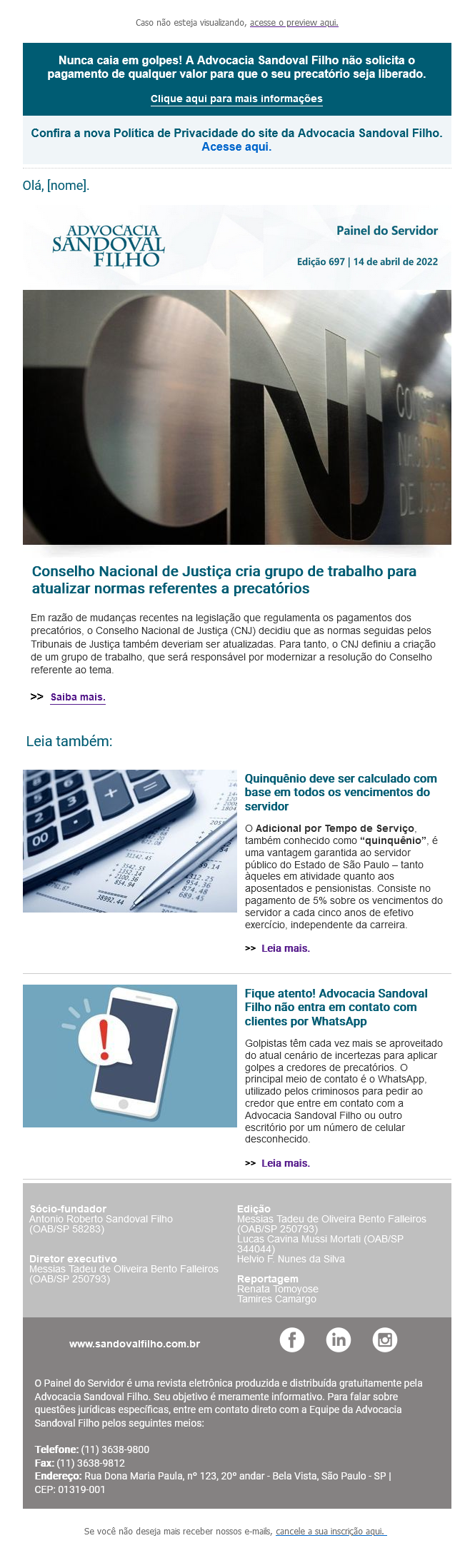 Confira a edição nº 697 do Painel do Servidor, enviada no dia 14 de abril de 2022.