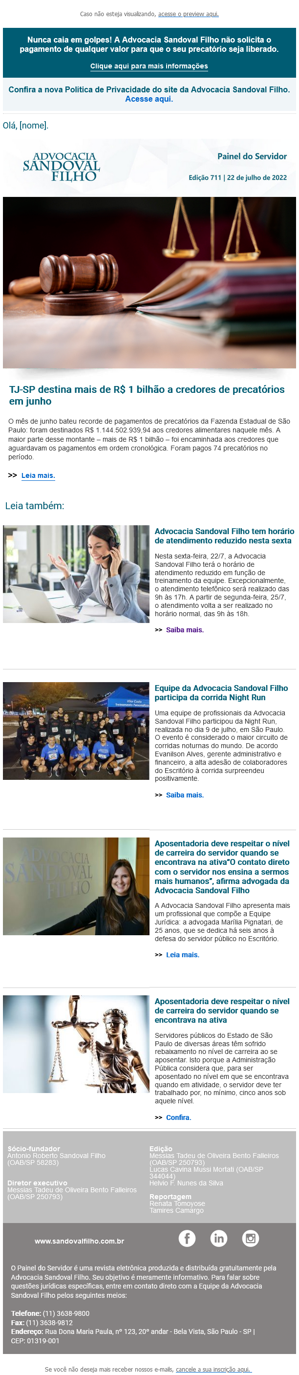 Nunca caia em golpes! A Advocacia Sandoval Filho não solicita o pagamento de qualquer valor para que o seu precatório seja liberado.