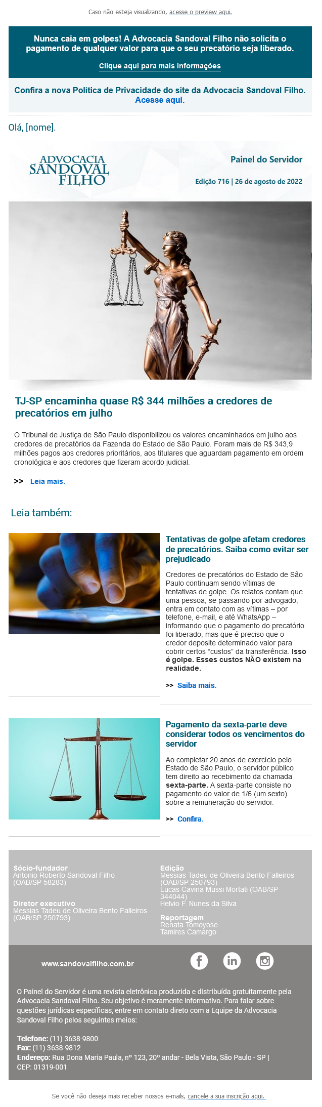 Nunca caia em golpes! A Advocacia Sandoval Filho não solicita o pagamento de qualquer valor para que o seu precatório seja liberado.