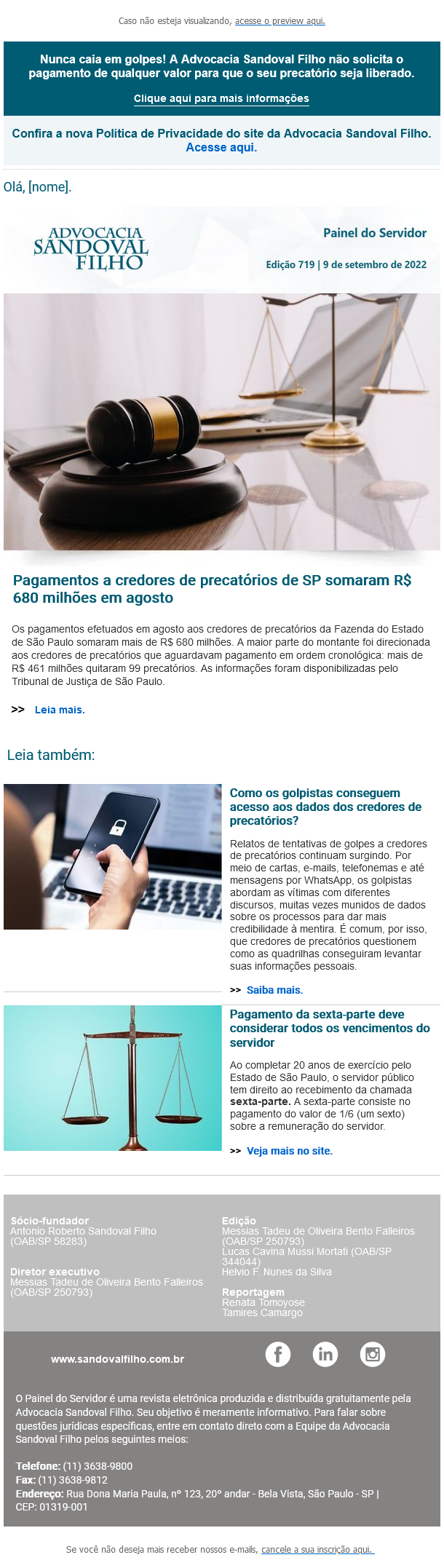 Nunca caia em golpes! A Advocacia Sandoval Filho não solicita o pagamento de qualquer valor para que o seu precatório seja liberado.