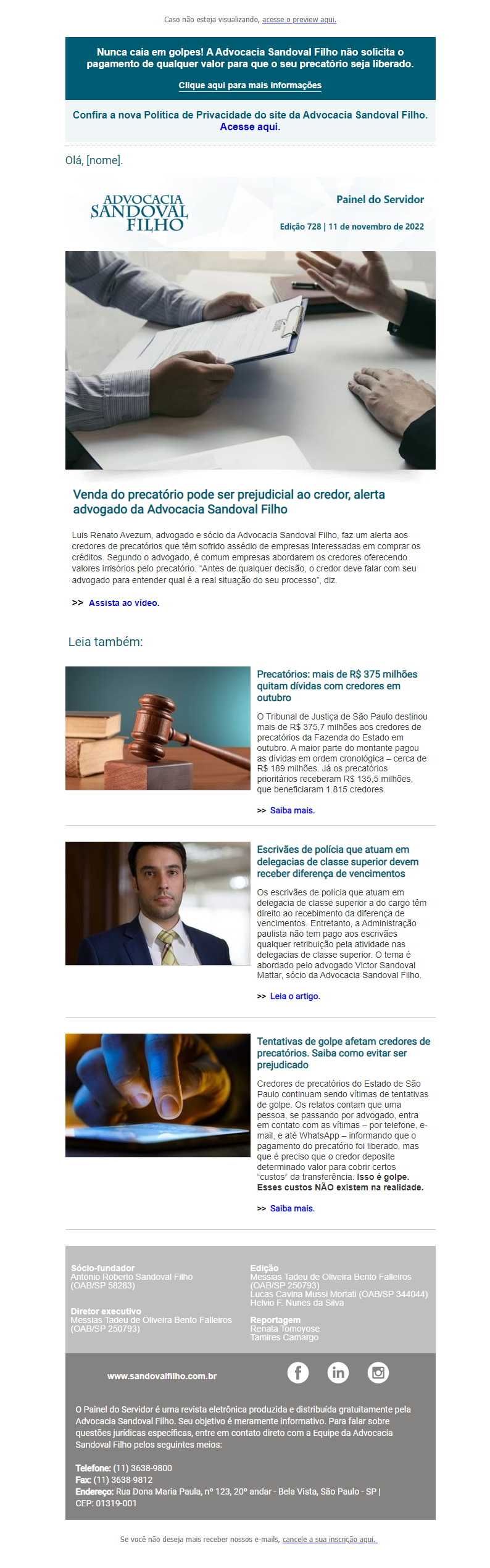 Nunca caia em golpes! A Advocacia Sandoval Filho não solicita o pagamento de qualquer valor para que o seu precatório seja liberado.