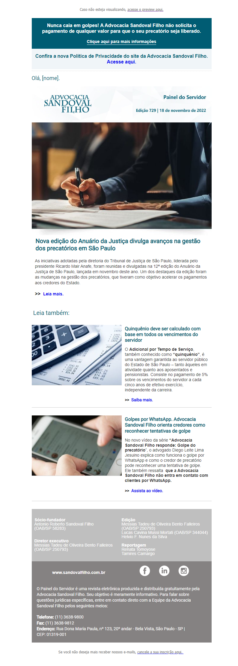 Nunca caia em golpes! A Advocacia Sandoval Filho não solicita o pagamento de qualquer valor para que o seu precatório seja liberado.