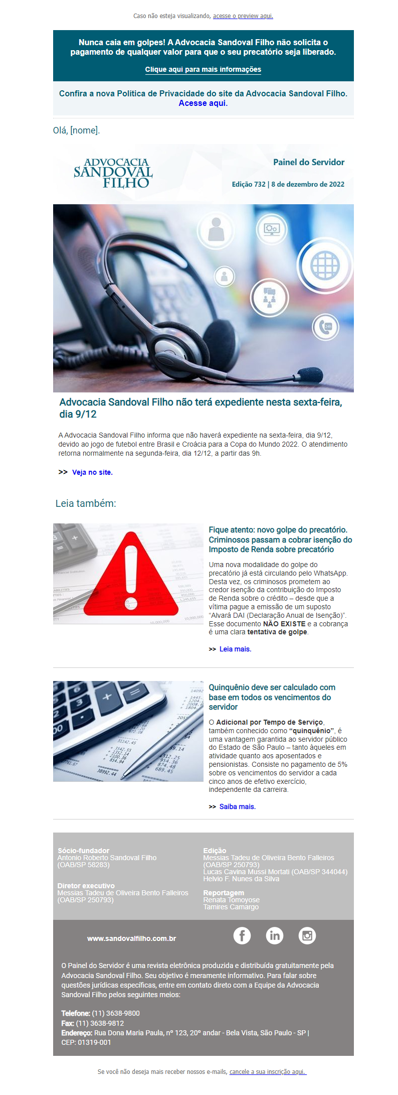 Nunca caia em golpes! A Advocacia Sandoval Filho não solicita o pagamento de qualquer valor para que o seu precatório seja liberado.
