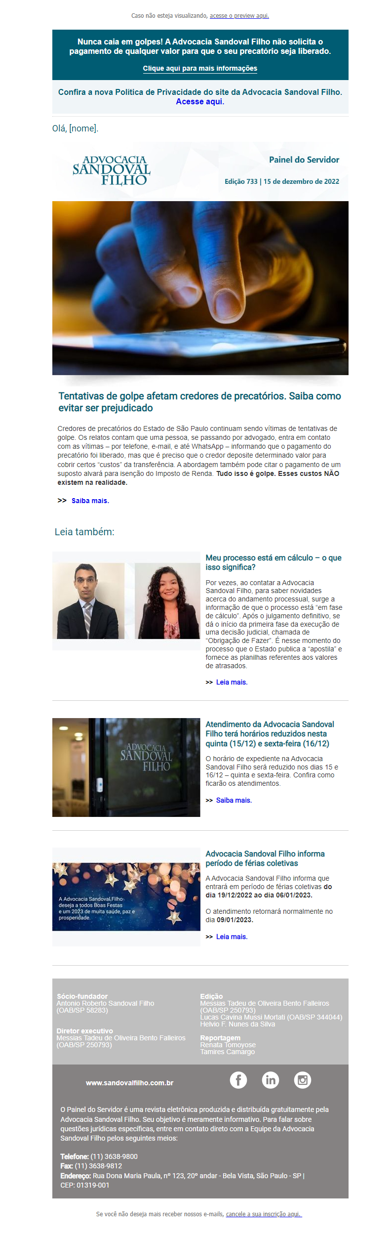 Confira a edição nº 733 do Painel do Servidor, enviada no dia 15 de dezembro de 2022.