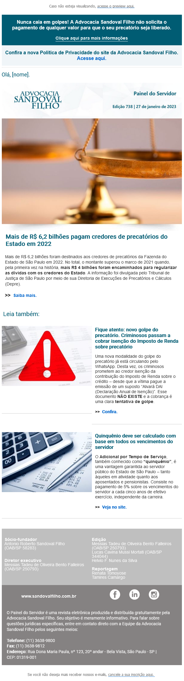 Confira a edição nº 738 do Painel do Servidor, enviada no dia 27 de janeiro de 2023.