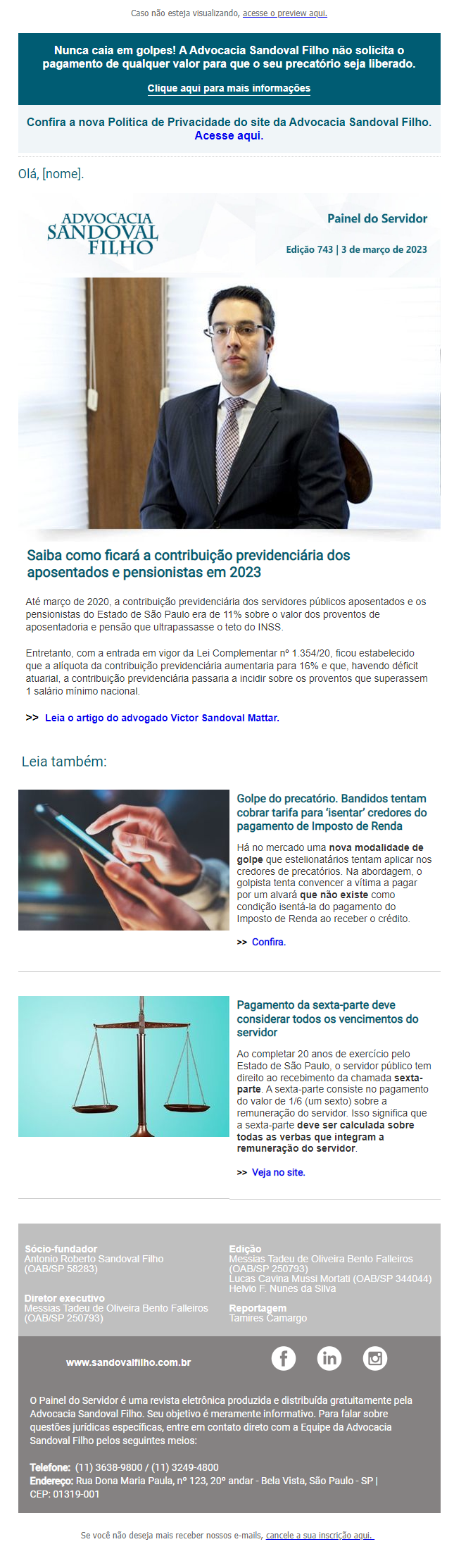 Nunca caia em golpes! A Advocacia Sandoval Filho não solicita o pagamento de qualquer valor para que o seu precatório seja liberado.