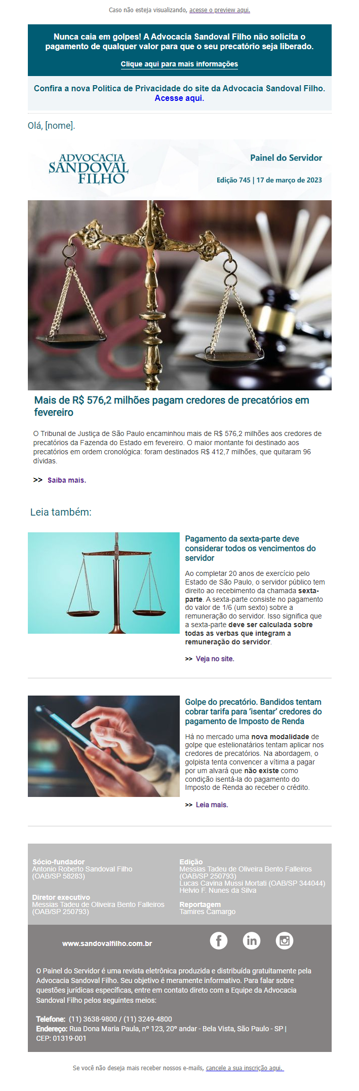 Nunca caia em golpes! A Advocacia Sandoval Filho não solicita o pagamento de qualquer valor para que o seu precatório seja liberado.