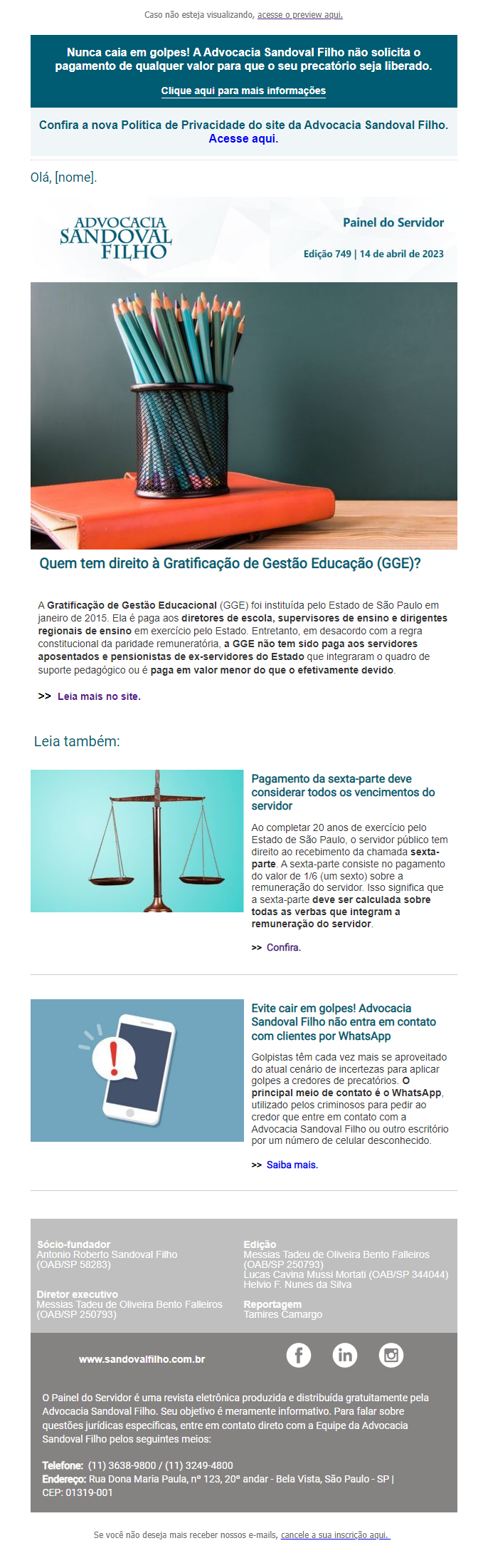 Confira a edição nº 749 do Painel do Servidor, enviada no dia 14 de abril de 2023.