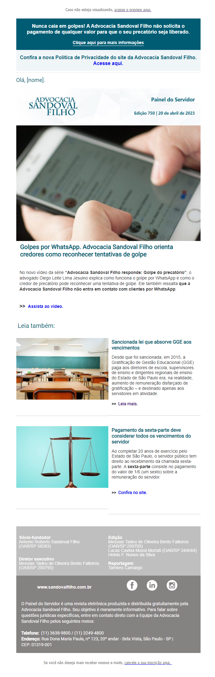 Confira a edição nº 750 do Painel do Servidor, enviada no dia 20 de abril de 2023.