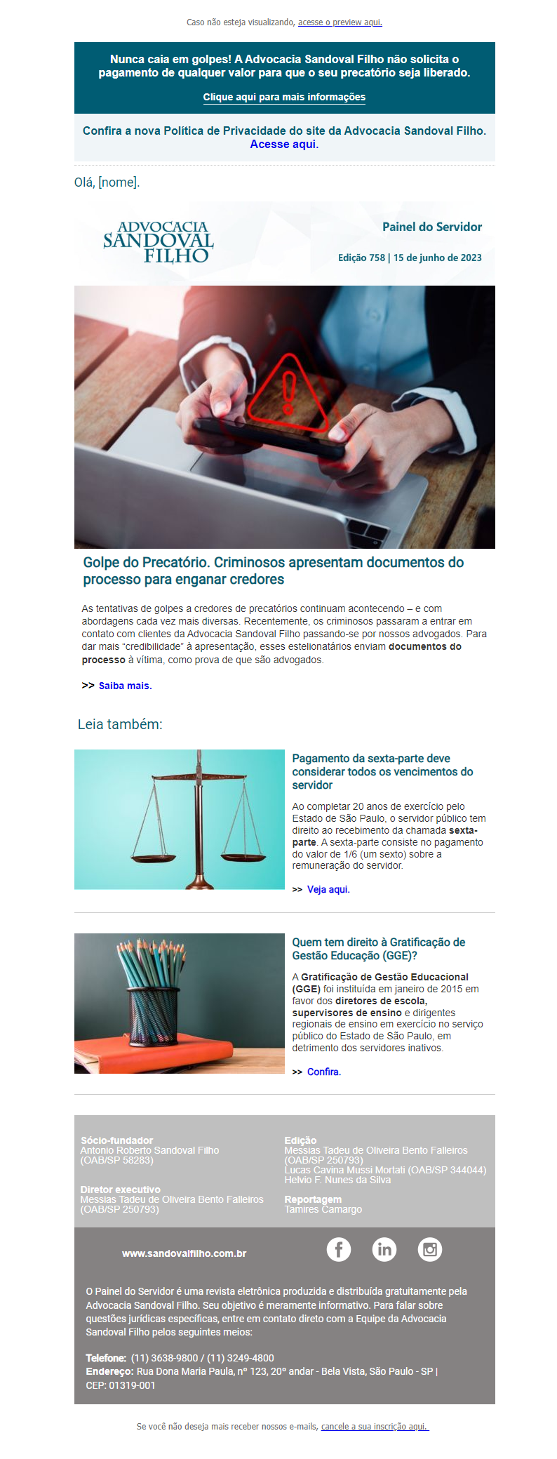 Nunca caia em golpes! A Advocacia Sandoval Filho não solicita o pagamento de qualquer valor para que o seu precatório seja liberado.