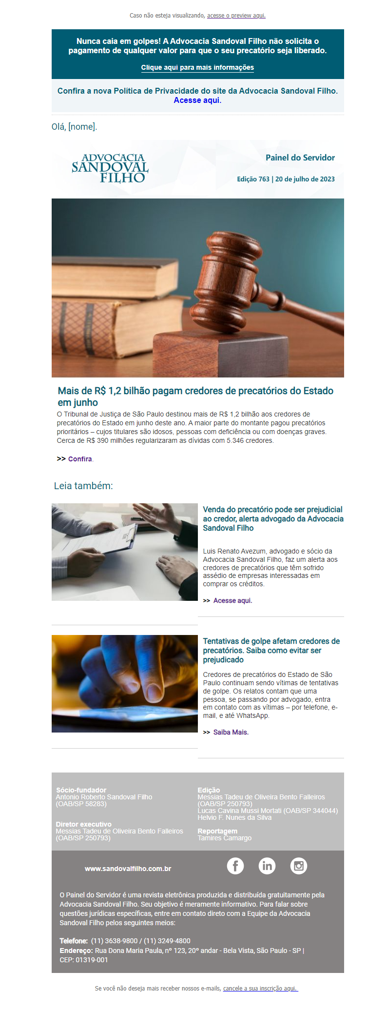 Nunca caia em golpes! A Advocacia Sandoval Filho não solicita o pagamento de qualquer valor para que o seu precatório seja liberado.