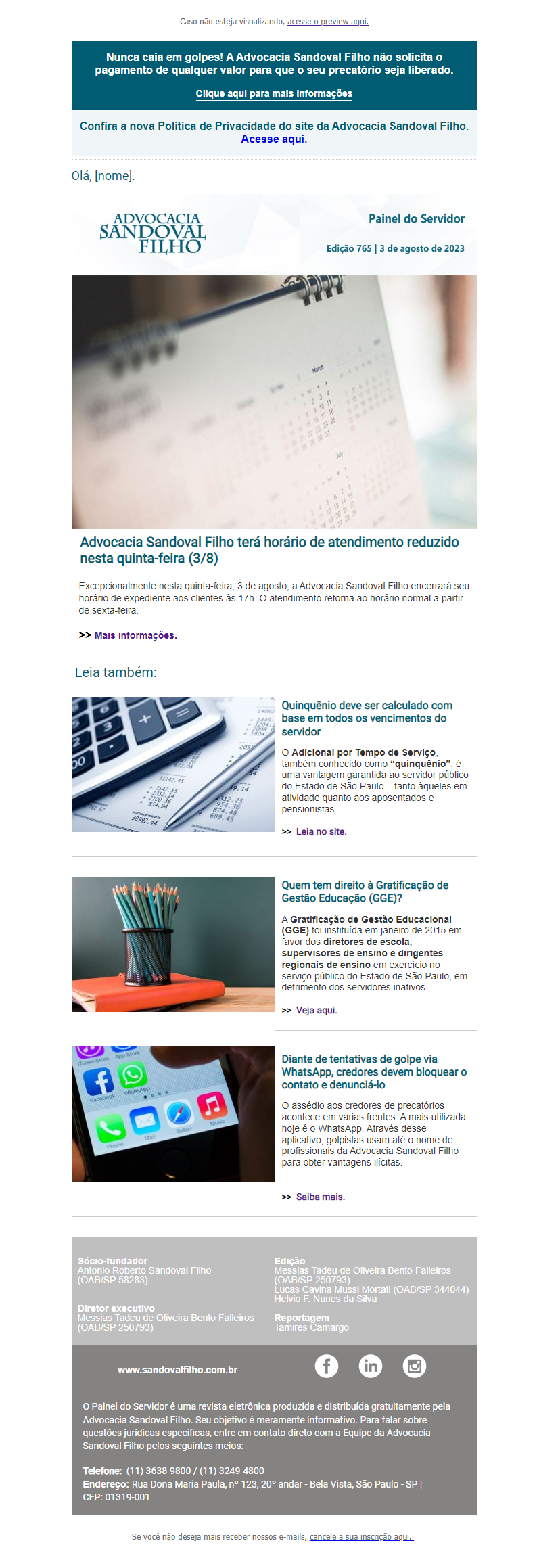 Confira a edição nº 765 do Painel do Servidor, enviada no dia 03 de agosto de 2023.