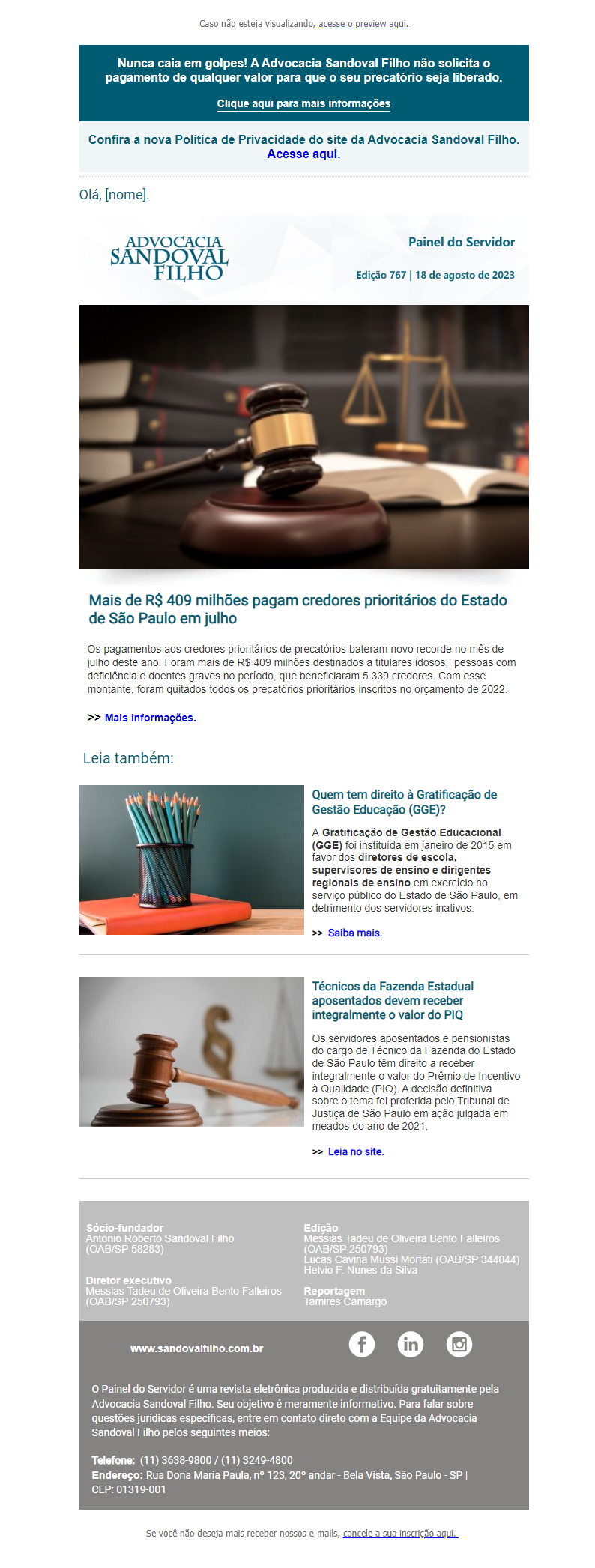 Confira a edição nº 767 do Painel do Servidor, enviada no dia 18 de agosto de 2023.