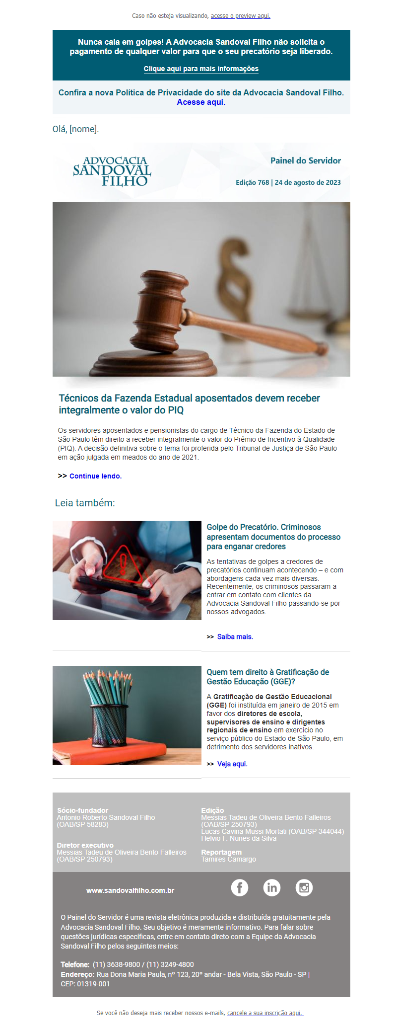 Confira a edição nº 768 do Painel do Servidor, enviada no dia 24 de agosto de 2023.