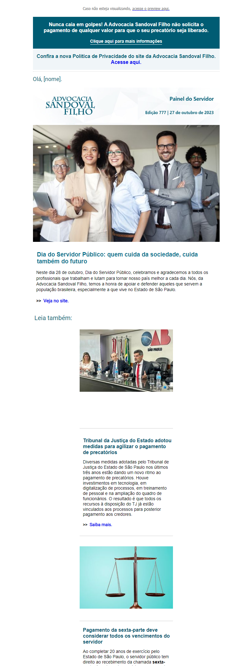 Confira a edição nº 777 do Painel do Servidor, enviada no dia 27 de outubro de 2023.