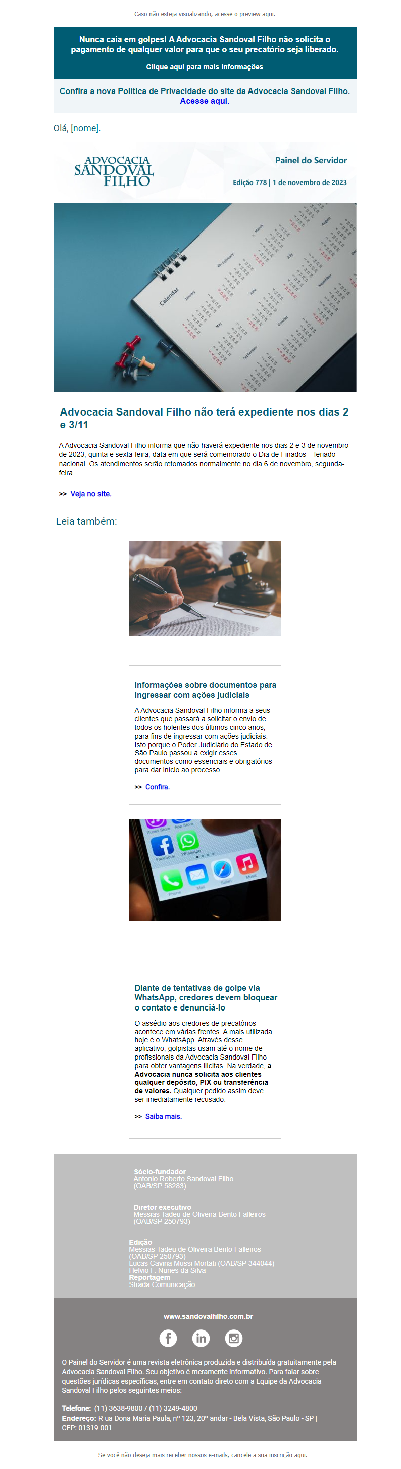 Nunca caia em golpes! A Advocacia Sandoval Filho não solicita o pagamento de qualquer valor para que o seu precatório seja liberado.